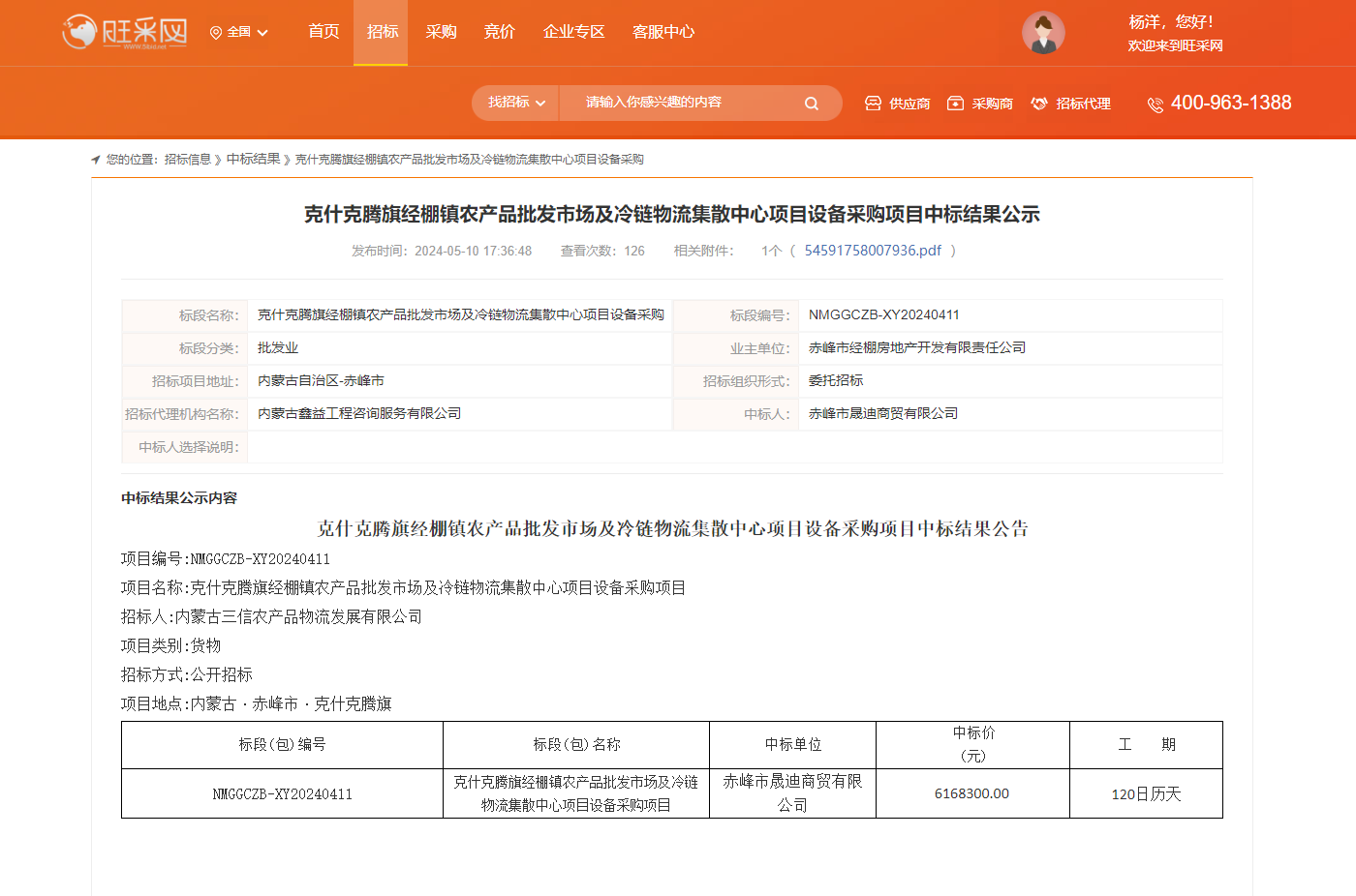 2024年4月15日,克什克腾旗经棚镇农产品批发市场及冷链物流集散中心项目通过旺采网内蒙古电子招标投标交易平台(以下简称“旺采网内蒙古平台”)发布克什克腾旗经棚镇农产品批发市场及冷链物流集散中心项目设备采购招标公告,经过投标、候选等手续,最终确认克什克腾旗经棚镇农产品批发市场及冷链物流集散中心项目设备采购项目中标单位为赤峰市晟迪商贸有限公司。