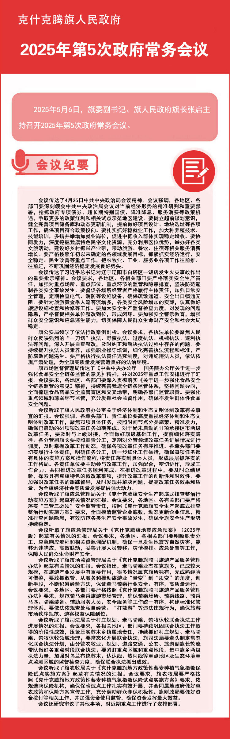 2025年5月6日,旗委副书记、旗人民政府旗长张启主持召开2025年第5次政府常务会议。会议传达了4月25日中共中央政治局会议精神。会议强调,各地区、各部门要深刻领会中共中央政治局会议对当前经济形势的精准研判和重要部署,抢抓政府专项债券、超长期特别国债、降准降息、服务消费等政策机遇,争取更多的政策红利和相关试点示范地区建设。要树立超前谋划意识,健全完善项目储备库和动态更新机制,提前做好项目设计、地块选址等各项工作,确保项目符合政策投向。要扎实抓好稳就业工作,加大种养殖技术、技能培训,多措并举增加就业岗位,促进中低收入群体实现稳定增收。要协同发力,深度挖掘我旗特色民俗文化资源,充分利用区位优势,举办好各类文旅活动,建设好乡村振兴产业带,带动旅游、餐饮、住宿等相关服务消费增长。要严格按照年初以来确定的各领域发展目标,抓紧抓实经济运行、安全稳定、民生改善等重点工作,把农牧业、工业、服务业各项工作往前推、往前赶,不断巩固经济稳定发展良好势头。会议传达了习近平总书记对辽宁辽阳市白塔区一饭店发生火灾事故作出的重要批示精神。会议要求,各地区、各相关部门要严格落实安全生产责任,加强对重点场所、重点部位、重点环节的监管和隐患排查,坚决防范遏制各类安全事故发生。要督促各场所经营者严格履行主体责任,加强日常安全管理,定期检查电气、消防等设施设备,确保疏散通道、安全出口畅通无阻。要针对旅游黄金季人流客流增多,各类安全风险增加的实际,认真做好旅游设施检查和检修等工作。要加大安全生产监督检查力度,对发现的问题隐患,严格督促相关单位整改到位,形成闭环。要加强安全警示教育,增强群众安全意识和应急逃生能力,切实保障人民群众生命财产安全和社会大局稳定。旗公安局领学了依法行政案例剖析。会议要求,各执法单位要聚焦人民群众反映强烈的“一刀切”执法、野蛮执法、过度执法、机械执法、逐利执法等问题,深入开展自查整改,及时纠正和解决执法过程中存在的问题。要持续提升执法人员素养,加强职业操守培训,细化完善执法流程和标准,严防腐败问题滋生。要严格执行执法责任追究制度,对违纪违法人员,依法依规严肃处理,为全旗高质量发展营造良好的法治环境。旗市场监督管理局传达了《中共中央办公厅 国务院办公厅关于进一步强化食品安全全链条监管的意见》精神,并对2025年重点工作安排进行了汇报。会议要求,各地区、各部门要深入贯彻落实《关于进一步强化食品安全全链条监管的意见》精神,持续完善我旗全链条监管体系,坚持问题导向,全面梳理食品药品安全监管盲区和交叉地带,明确各部门监管职责。要强化重点领域和薄弱环节监管,充分发挥社会监督作用,确保不发生群体性食品安全问题。会议听取了旗人民政府办公室关于经济体制和生态文明体制改革有关事宜的汇报。会议强调,各牵头部门、责任单位要高度重视经济体制和生态文明体制改革工作,聚焦72项具体任务,按照时间节点分类施策、精准发力,确保已启动的61项项改革任务如期完成。对于尚未启动的11项承接区市两级改革任务,要及时与上级对接,全面做好旗级基础工作,提前细化落实路径。各分管副旗长要按照职责分工,定期对分管领域改革任务进展情况进行调度,及时掌握改革工作动态,确保各项改革任务有序推进。各牵头部门要切实履行主体责任,明确任务分工,进一步细化工作举措,确保每项任务都有具体的实施方案和操作流程,将责任落实到具体人员,形成层层抓落实的工作格局。各责任单位要主动参与改革工作,加强配合,密切协作,形成工作合力,共同推进改革任务顺利完成。在推进改革过程中,要及时总结经验,探索具有克旗特色的微改革事项,提升改革工作的创新性和时效性。要加强对改革任务的跟踪督导,及时发现并解决问题,提高改革任务效果和质量,为全旗经济社会高质量发展提供强大动力。会议听取了旗应急管理局关于《克什克腾旗安全生产起底式排查整治行动实施方案》起草有关情况的汇报。会议要求,各地区、各有关部门要严格落实“三管三必须”安全监管责任,按照《克什克腾旗安全生产起底式排查整治行动实施方案》要求,全面摸清监管企业底数,动态更新企业信息,精准排查问题隐患,有效防范各类生产安全事故发生,确保全旗安全生产形势持续稳定。会议听取了旗应急管理局关于《克什克腾旗地震应急预案》(2025年版)起草有关情况的汇报。会议要求,各地区、各相关部门要明晰职责分工、应急响应流程和相关资源调配机制,确保一旦发生地震等自然灾害,能够迅速响应,高效联动,妥善开展人员转移、灾情摸排、应急处置等工作,保障人民群众生命财产安全。会议听取了旗市场监督管理局关于《克什克腾旗骑马旅游产品服务管理办法》起草有关情况的汇报。会议指出,牵马骑乘业态在克旗多,已成较大规模,在旅游产业发展中有重要作用,很多情况属克旗所独有,无成熟经验可借鉴,要敢抓敢管,从服务和推动旅游业“量变”到“质变”的角度,创新手段,不断积累经验方法,保证牵马骑乘行业安全、有序,高质量运行。会议要求,各地区、各部门要严格按照《克什克腾旗骑马旅游产品服务管理办法》要求,规范骑马牵乘旅游市场管理,确保