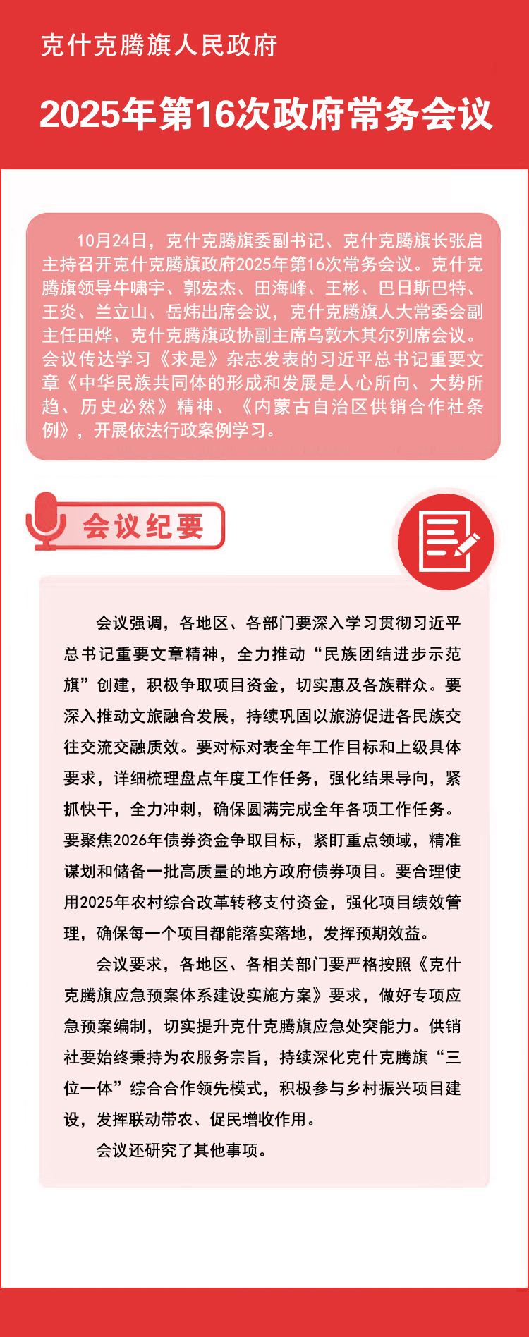10月24日,克什克腾旗委副书记、克什克腾旗长张启主持召开克什克腾旗人民政府2025年第16次常务会议。克什克腾旗领导牛啸宇、郭宏杰、田海峰、王彬、巴日斯巴特、王炎、兰立山、岳炜出席会议,克什克腾旗人大常委会副主任田烨、克什克腾旗政协副主席乌敦木其尔列席会议。会议传达学习《求是》杂志发表的习近平总书记重要文章《中华民族共同体的形成和发展是人心所向、大势所趋、历史必然》精神、《内蒙古自治区供销合作社条例》,开展依法行政案例学习。会议强调,各地区、各部门要深入学习贯彻习近平总书记重要文章精神,全力推动“民族团结进步示范旗”创建,积极争取项目资金,切实惠及各族群众。要深入推动文旅融合发展,持续巩固以旅游促进各民族交往交流交融质效。要对标对表全年工作目标和上级具体要求,详细梳理盘点年度工作任务,强化结果导向,紧抓快干,全力冲刺,确保圆满完成全年各项工作任务。要聚焦2026年债券资金争取目标,紧盯重点领域,精准谋划和储备一批高质量的地方政府债券项目。要合理使用2025年农村综合改革转移支付资金,强化项目绩效管理,确保每一个项目都能落实落地,发挥预期效益。会议要求,各地区、各相关部门要严格按照《克什克腾旗应急预案体系建设实施方案》要求,做好专项应急预案编制,切实提升克什克腾旗应急处突能力。供销社要始终秉持为农服务宗旨,持续深化克什克腾旗“三位一体”综合合作领先模式,积极参与乡村振兴项目建设,发挥联动带农、促民增收作用。会议还研究了其他事项。