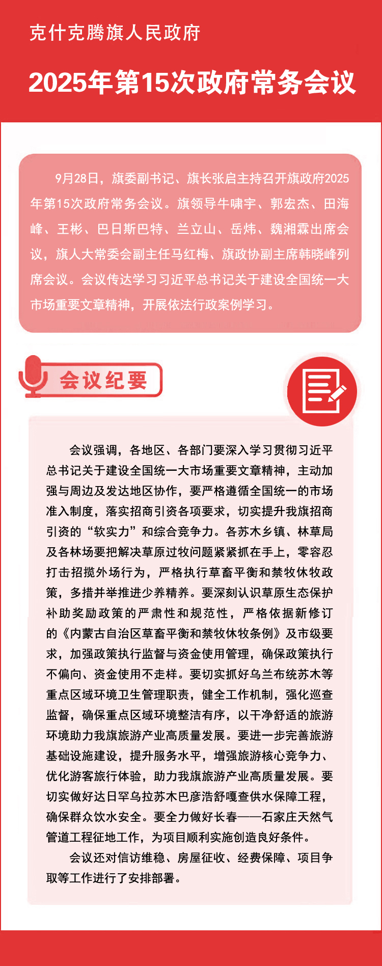 9月28日,旗委副书记、旗长张启主持召开旗政府2025年第15次政府常务会议。旗领导牛啸宇、郭宏杰、田海峰、王彬、巴日斯巴特、兰立山、岳炜、魏湘霖出席会议,旗人大常委会副主任马红梅、旗政协副主席韩晓峰列席会议。会议传达学习习近平总书记关于建设全国统一大市场重要文章精神,开展依法行政案例学习。会议强调,各地区、各部门要深入学习贯彻习近平总书记关于建设全国统一大市场重要文章精神,主动加强与周边及发达地区协作,要严格遵循全国统一的市场准入制度,落实招商引资各项要求,切实提升我旗招商引资的“软实力”和综合竞争力。各苏木乡镇、林草局及各林场要把解决草原过牧问题紧紧抓在手上,零容忍打击招揽外场行为,严格执行草畜平衡和禁牧休牧政策,多措并举推进少养精养。要深刻认识草原生态保护补助奖励政策的严肃性和规范性,严格依据新修订的《内蒙古自治区草畜平衡和禁牧休牧条例》及市级要求,加强政策执行监督与资金使用管理,确保政策执行不偏向、资金使用不走样。要切实抓好乌兰布统苏木等重点区域环境卫生管理职责,健全工作机制,强化巡查监督,确保重点区域环境整洁有序,以干净舒适的旅游环境助力我旗旅游产业高质量发展。要进一步完善旅游基础设施建设,提升服务水平,增强旅游核心竞争力、优化游客旅行体验,助力我旗旅游产业高质量发展。要切实做好达日罕乌拉苏木巴彦浩舒嘎查供水保障工程,确保群众饮水安全。要全力做好长春——石家庄天然气管道工程征地工作,为项目顺利实施创造良好条件。会议还对信访维稳、房屋征收、经费保障、项目争取等工作进行了安排部署。