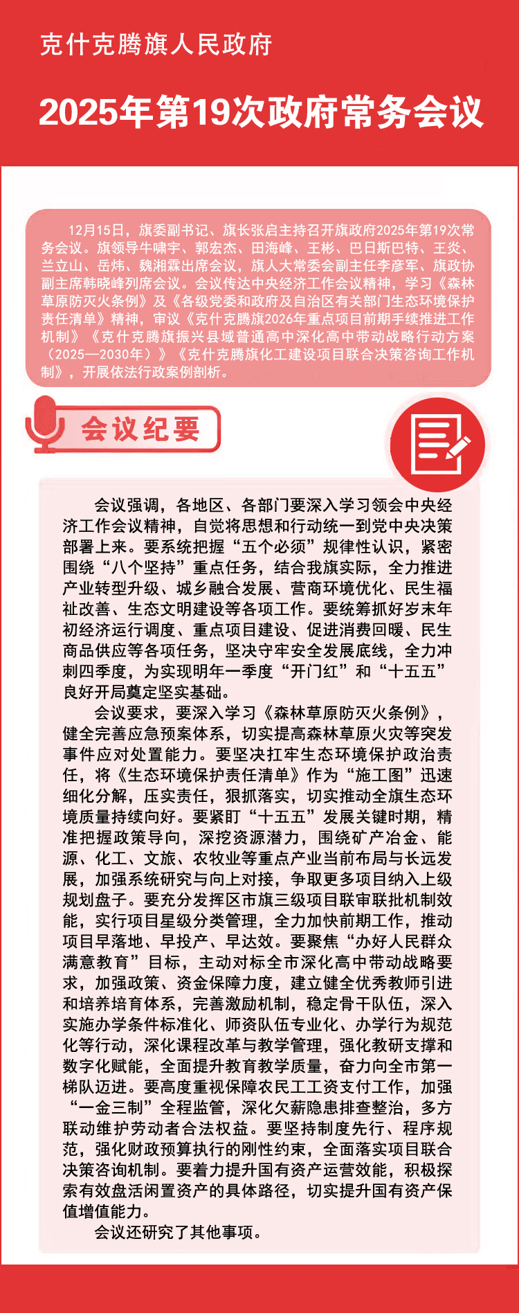 12月15日,旗委副书记、旗长张启主持召开旗政府2025年第19次常务会议。旗领导牛啸宇、郭宏杰、田海峰、王彬、巴日斯巴特、王炎、兰立山、岳炜、魏湘霖出席会议,旗人大常委会副主任李彦军、旗政协副主席韩晓峰列席会议。会议传达中央经济工作会议精神,学习《森林草原防灭火条例》及《各级党委和政府及自治区有关部门生态环境保护责任清单》精神,审议《克什克腾旗2026年重点项目前期手续推进工作机制》《克什克腾旗振兴县域普通高中深化高中带动战略行动方案(2025—2030年)》《克什克腾旗化工建设项目联合决策咨询工作机制》,开展依法行政案例剖析。会议强调,各地区、各部门要深入学习领会中央经济工作会议精神,自觉将思想和行动统一到党中央决策部署上来。要系统把握“五个必须”规律性认识,紧密围绕“八个坚持”重点任务,结合我旗实际,全力推进产业转型升级、城乡融合发展、营商环境优化、民生福祉改善、生态文明建设等各项工作。要统筹抓好岁末年初经济运行调度、重点项目建设、促进消费回暖、民生商品供应等各项任务,坚决守牢安全发展底线,全力冲刺四季度,为实现明年一季度“开门红”和“十五五”良好开局奠定坚实基础。会议要求,要深入学习《森林草原防灭火条例》,健全完善应急预案体系,切实提高森林草原火灾等突发事件应对处置能力。要坚决扛牢生态环境保护政治责任,将《生态环境保护责任清单》作为“施工图”迅速细化分解,压实责任,狠抓落实,切实推动全旗生态环境质量持续向好。要紧盯“十五五”发展关键时期,精准把握政策导向,深挖资源潜力,围绕矿产冶金、能源、化工、文旅、农牧业等重点产业当前布局与长远发展,加强系统研究与向上对接,争取更多项目纳入上级规划盘子。要充分发挥区市旗三级项目联审联批机制效能,实行项目星级分类管理,全力加快前期工作,推动项目早落地、早投产、早达效。要聚焦“办好人民群众满意教育”目标,主动对标全市深化高中带动战略要求,加强政策、资金保障力度,建立健全优秀教师引进和培养培育体系,完善激励机制,稳定骨干队伍,深入实施办学条件标准化、师资队伍专业化、办学行为规范化等行动,深化课程改革与教学管理,强化教研支撑和数字化赋能,全面提升教育教学质量,奋力向全市第一梯队迈进。要高度重视保障农民工工资支付工作,加强“一金三制”全程监管,深化欠薪隐患排查整治,多方联动维护劳动者合法权益。要坚持制度先行、程序规范,强化财政预算执行的刚性约束,全面落实项目联合决策咨询机制。要着力提升国有资产运营效能,积极探索有效盘活闲置资产的具体路径,切实提升国有资产保值增值能力。会议还研究了其他事项。