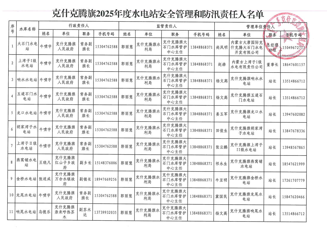 克什克腾旗2025年度水电站安全管理和防汛责任人名单